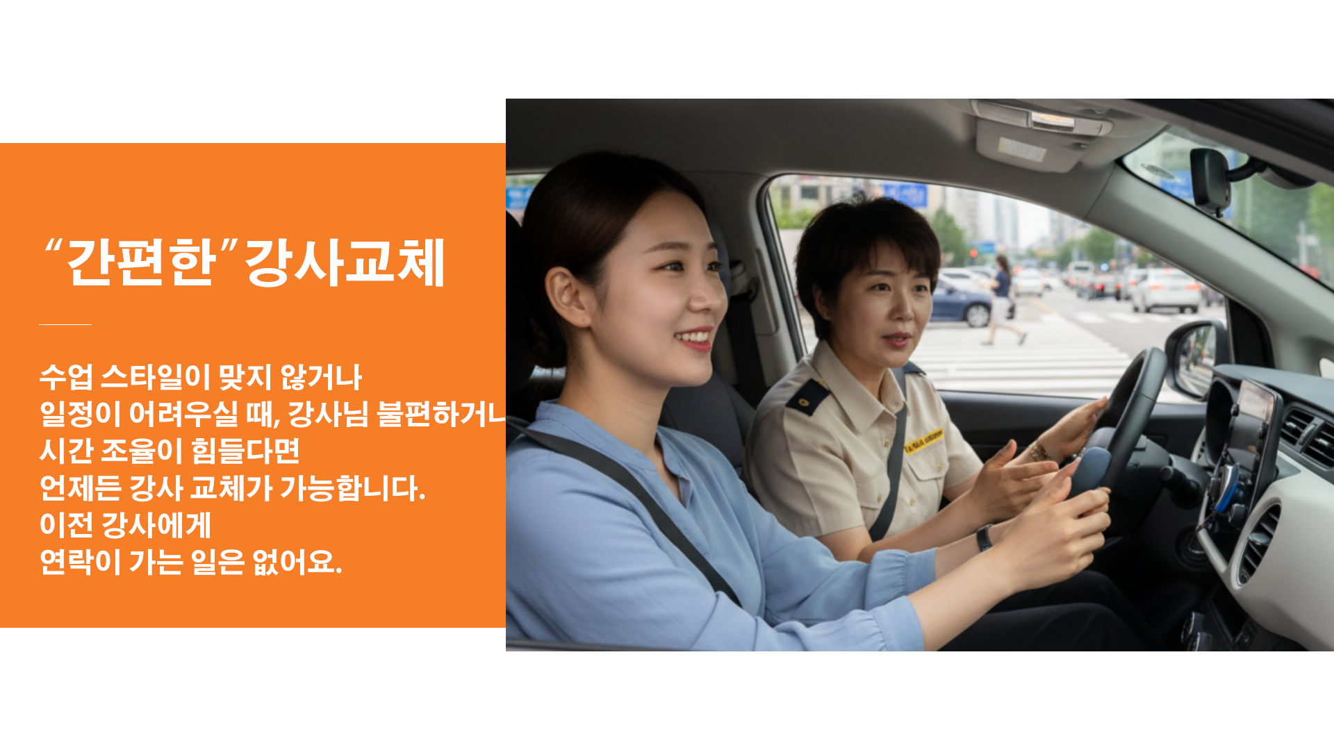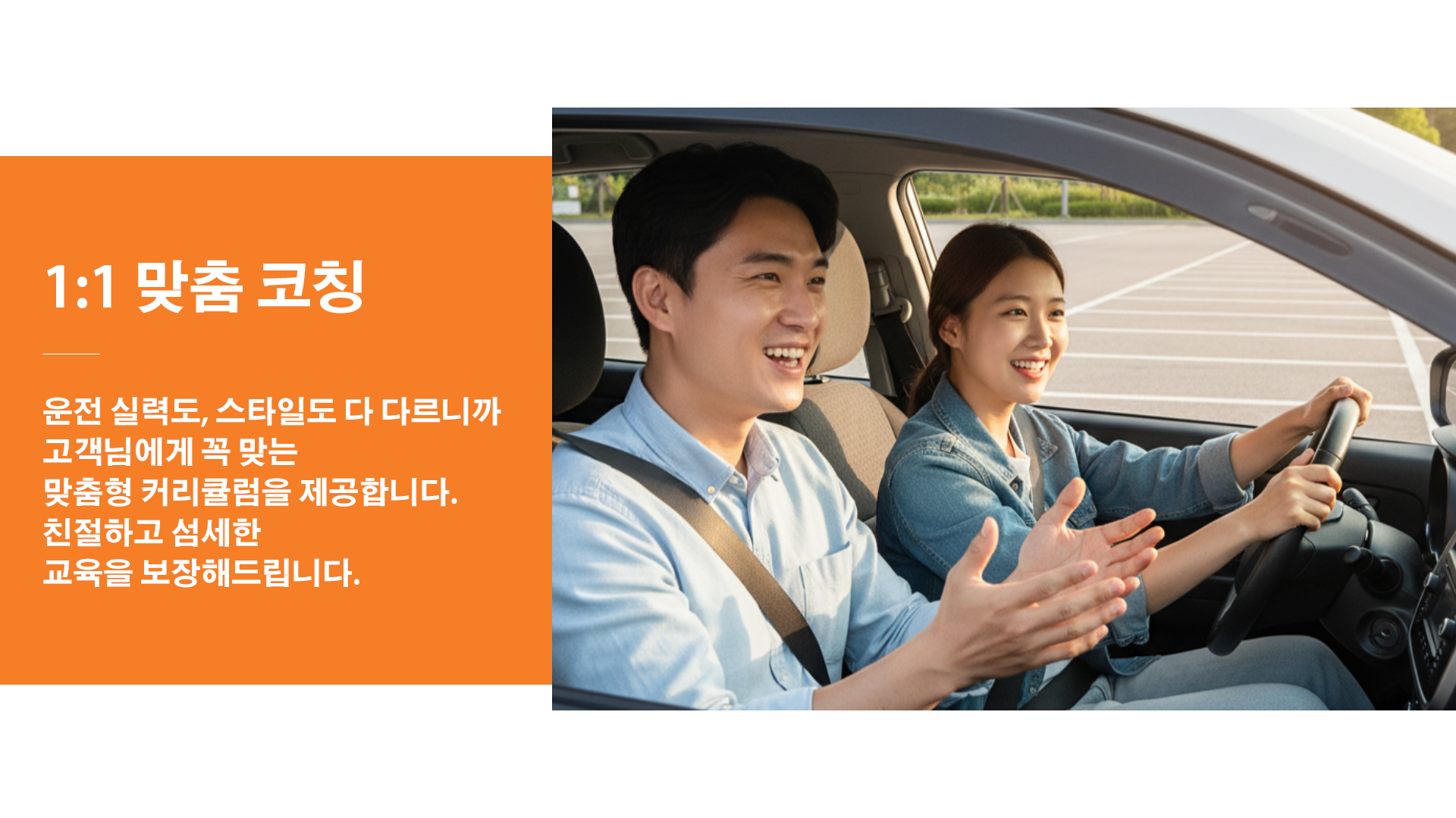 보조브레이크가 장착된 연수차로 진행하는 것이 기본이며 자차 연수도 가능합니다. 자차 이용 시 차량 상태와 보험 조건을 반드시 확인해야 해요.